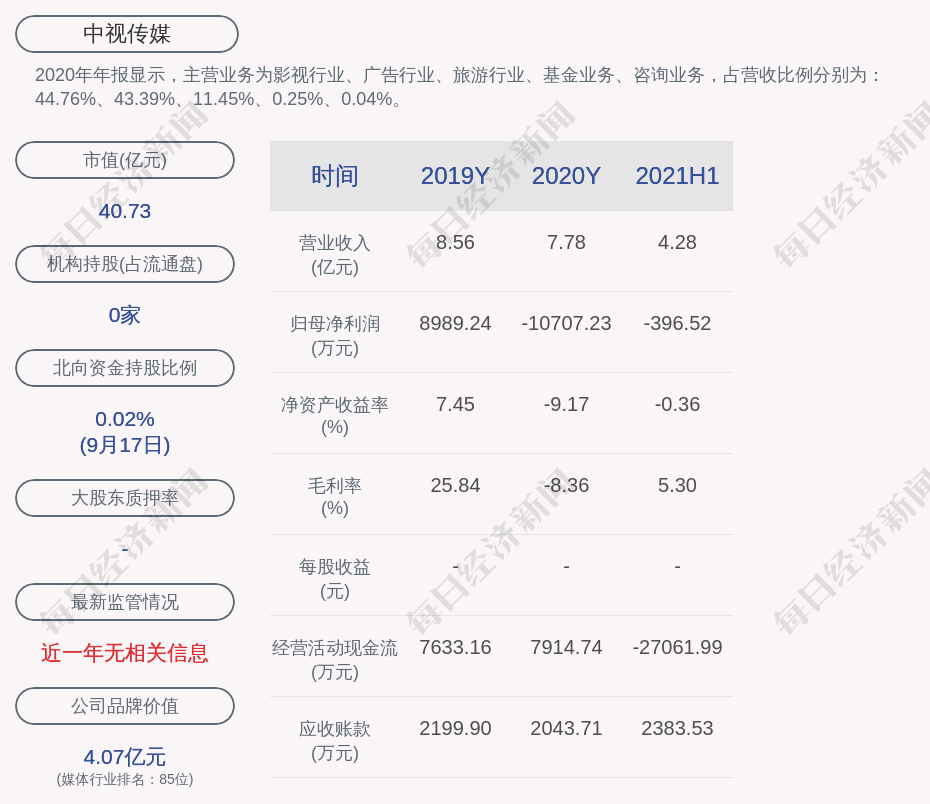 2020年年报显示,中视传媒的主营业务为影视行业、广告行业、旅游行业、基金业务、咨询业务,占营收比例分别为:44.76%、43.39%、11.45%、0.25%、0.04%。