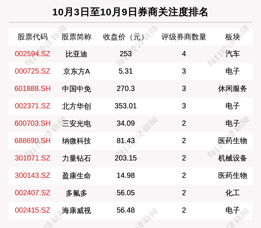 从券商对个股的关注程度来看,有12只个股获得多家券商关注,券商关注数量排名居前的个股是比亚迪(002594.SZ)、京东方A(000725.SZ)、中国中免(601888.SH)。