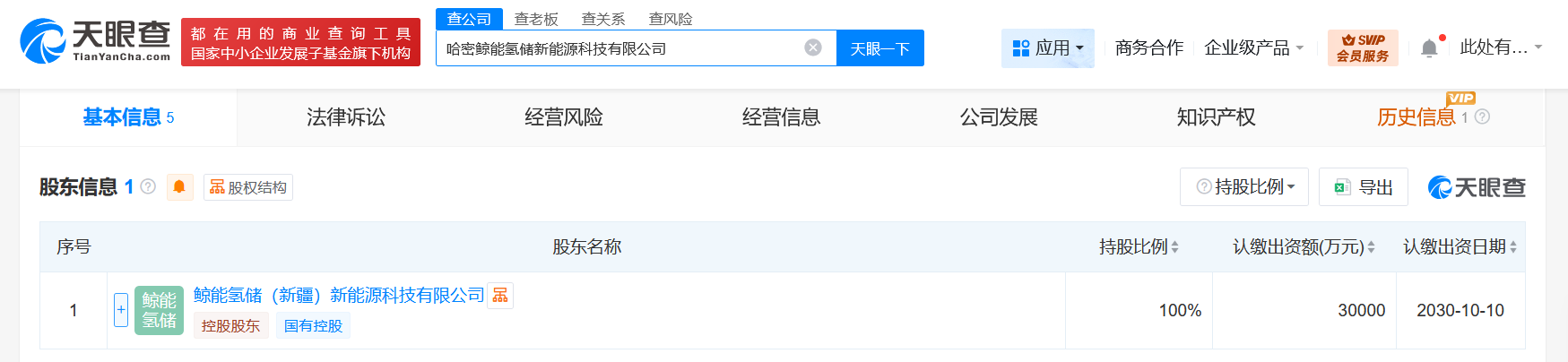 每经AI快讯,天眼查工商信息显示,近日,哈密鲸能氢储新能源科技有限公司成立,法定代表人为陈汉雨,注册资本3亿元人民币,经营范围含新兴能源技术研发、热力生产和供应、供冷服务、储能技术服务、余热发电关键技术研发、余热余压余气利用技术研发、在线能源监测技术研发、运行效能评估服务、站用加氢及储氢设施销售节能管理服务等。股东信息显示,该公司由鲸能氢储(新疆)新能源科技有限公司全资持股。