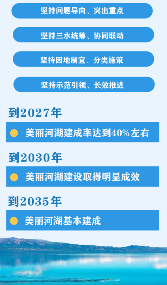 在总体要求方面,《行动方案》提出,坚持问题导向、突出重点,着力解决水生态环境保护方面存在的突出问题,不断满足人民群众的亲水需求,统筹美丽河湖建设与防洪排涝安全,促进人水和谐。到2027年,美丽河湖建成率达到40%左右;到2030年,美丽河湖建设取得明显成效;到2035年,美丽河湖基本建成。