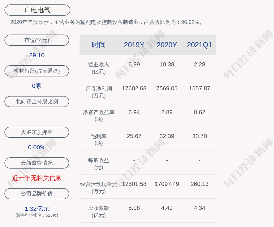 2020年年报显示,广电电气的主营业务为输配电及控制设备制造业,占营收比例为:96.92%。