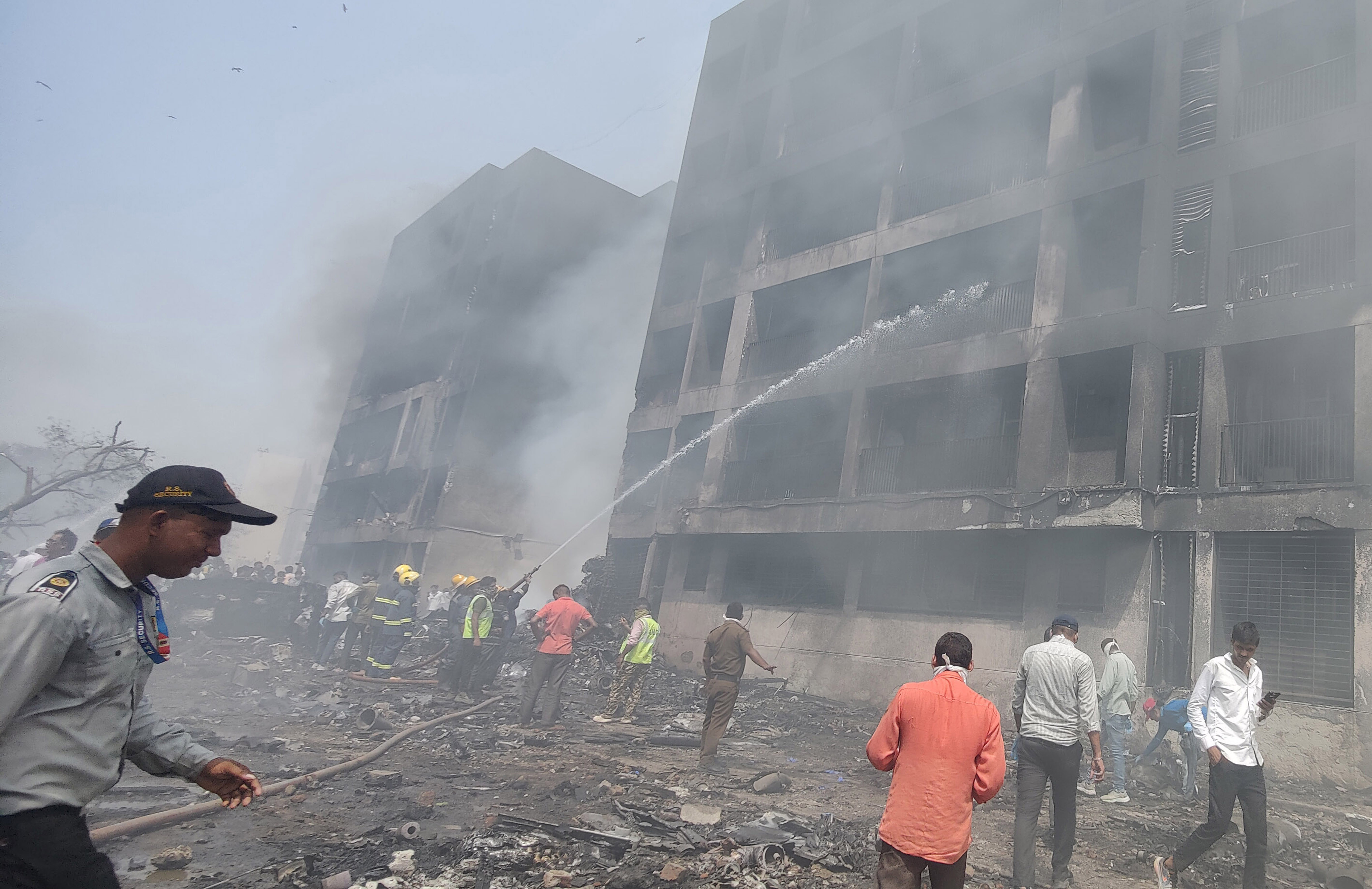 6月12日,消防员在印度古吉拉特邦艾哈迈达巴德附近坠机现场灭火。图片来源:新华社/美联