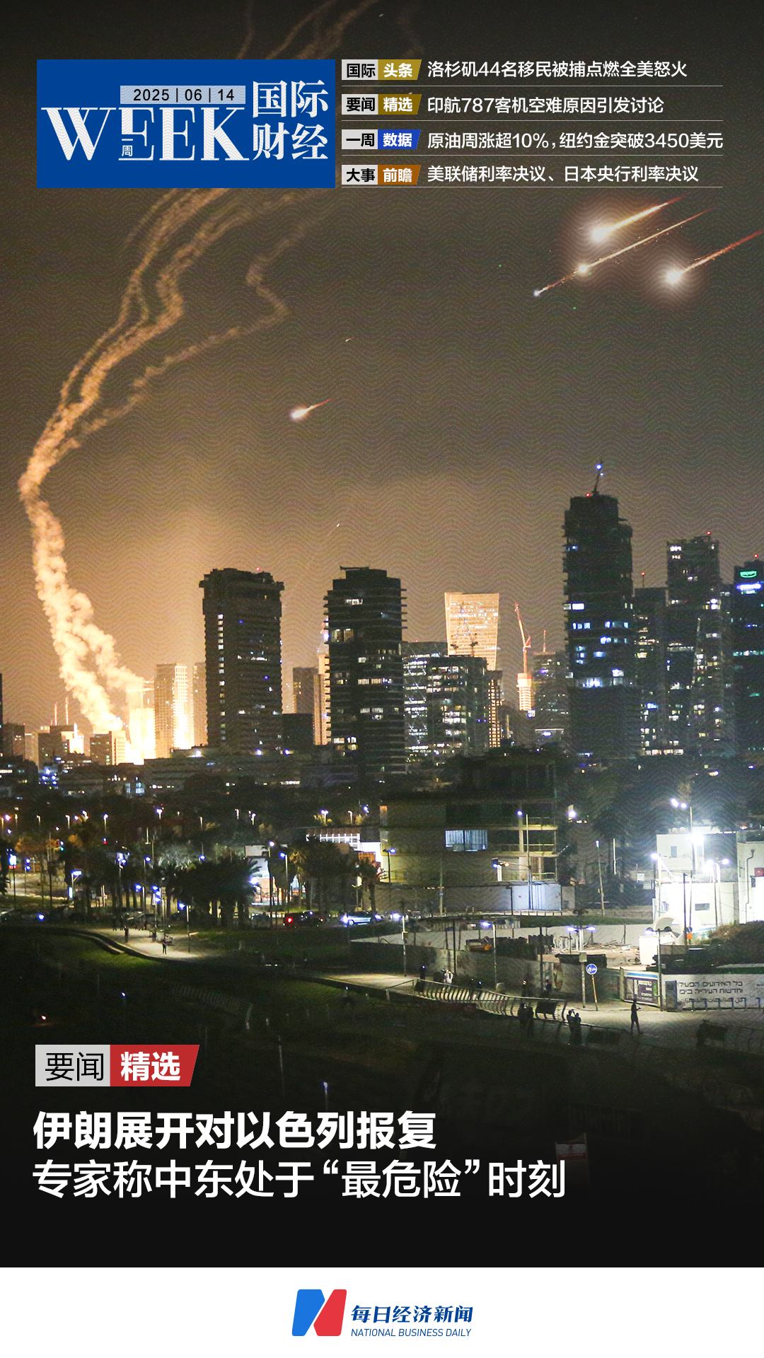 ◆ 伊朗四波导弹袭击回击以色列,专家称中东处于“最危险”时刻,美油布油周涨超10%,纽约期金连涨3天,突破3450美元/盎司;遇难人数升至279人!印航787客机空难原因引发讨论;沃尔玛、亚马逊据称将探索发行稳定币;白宫着手审查SpaceX数十亿美元联邦合同。