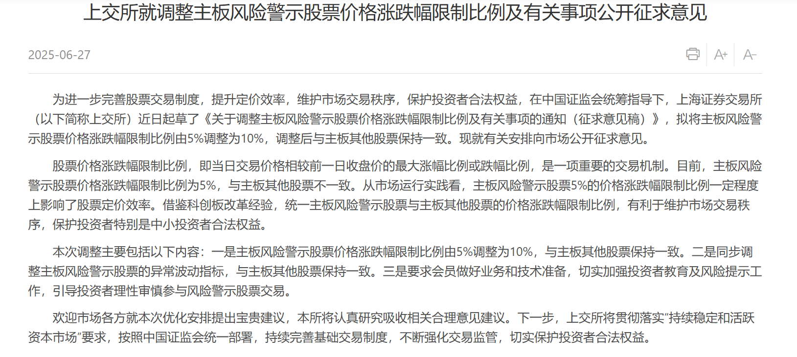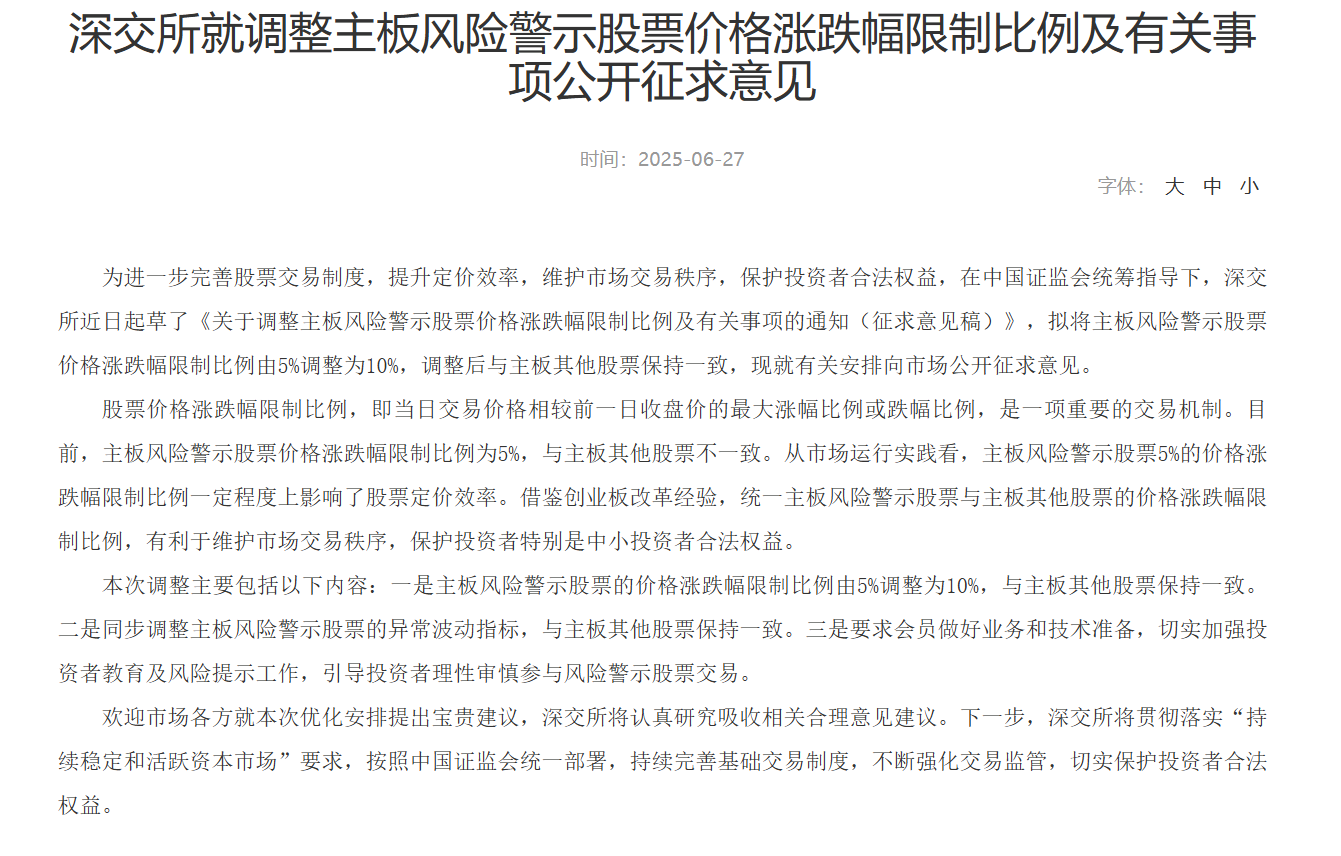 今日收盘后,上交所、深交所同步发布《就调整主板风险警示股票价格涨跌幅限制比例及有关事项公开征求意见》。