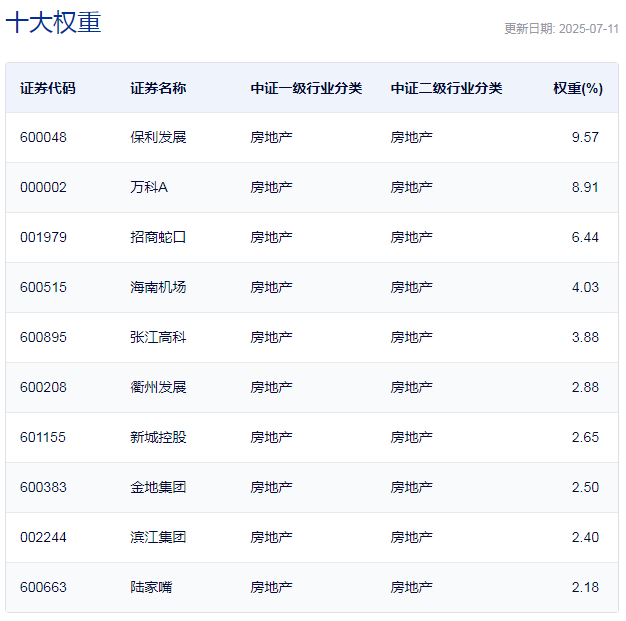 中证全指房地产指数主要权重股包括保利地产、万科A以及招商蛇口,三只个股权重占比超过20%。上述三只个股同样为每经品牌100指数成分股,因此具备投资覆盖意义。