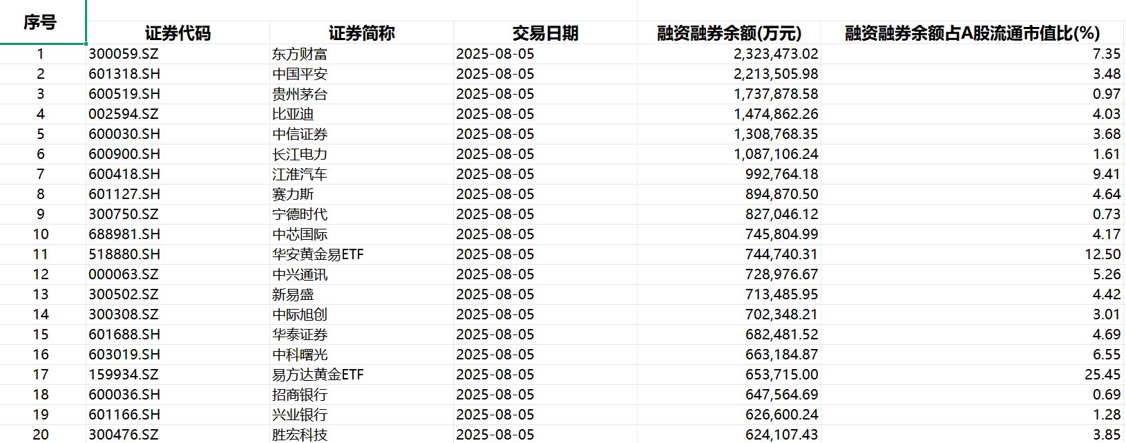 Choice金融终端数据显示,截至8月5日,共有6只个股融资融券余额超过100亿元。东方财富以232.35亿元的两融余额排名第一,中国平安以218.52 亿元紧随其后,贵州茅台、比亚迪、中信证券、长江电力也均在百亿元梯队之列。
