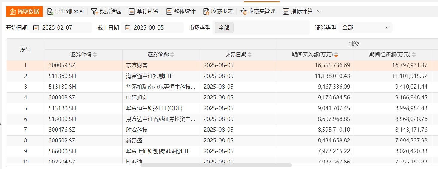 再看近半年来个券融资交易情况。2月7日至8月5日,东方财富一共被融资买入1655.57亿元,排名第一。另一只被融资买入超千亿的标的是海富通中证短融ETF,区间融资买入金额达1110.19亿元。而在港股市场火爆的背景下,华泰柏瑞南方东英恒生科技ETF、华夏恒生科技ETF、易方达中证香港证券投资主题ETF也均被大量融资买入。