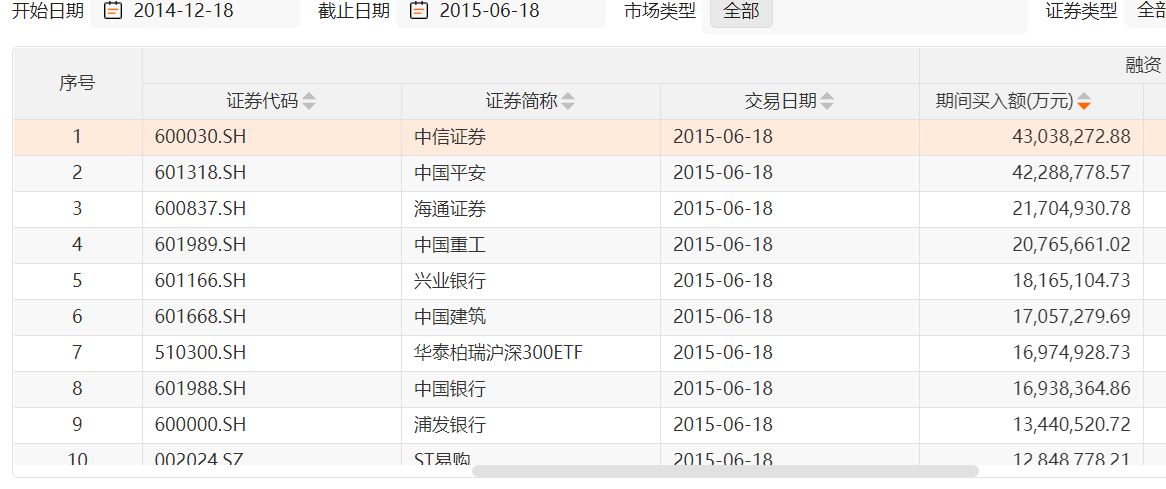 反观2015年6月18日(两融创下2.27万亿天量当天),除了华泰柏瑞沪深300ETF、华夏上证50ETF、嘉实沪深300ETF外,两融余额前十名的个券中,包括6只金融股,制造业中仅有中国重工跻身其中。