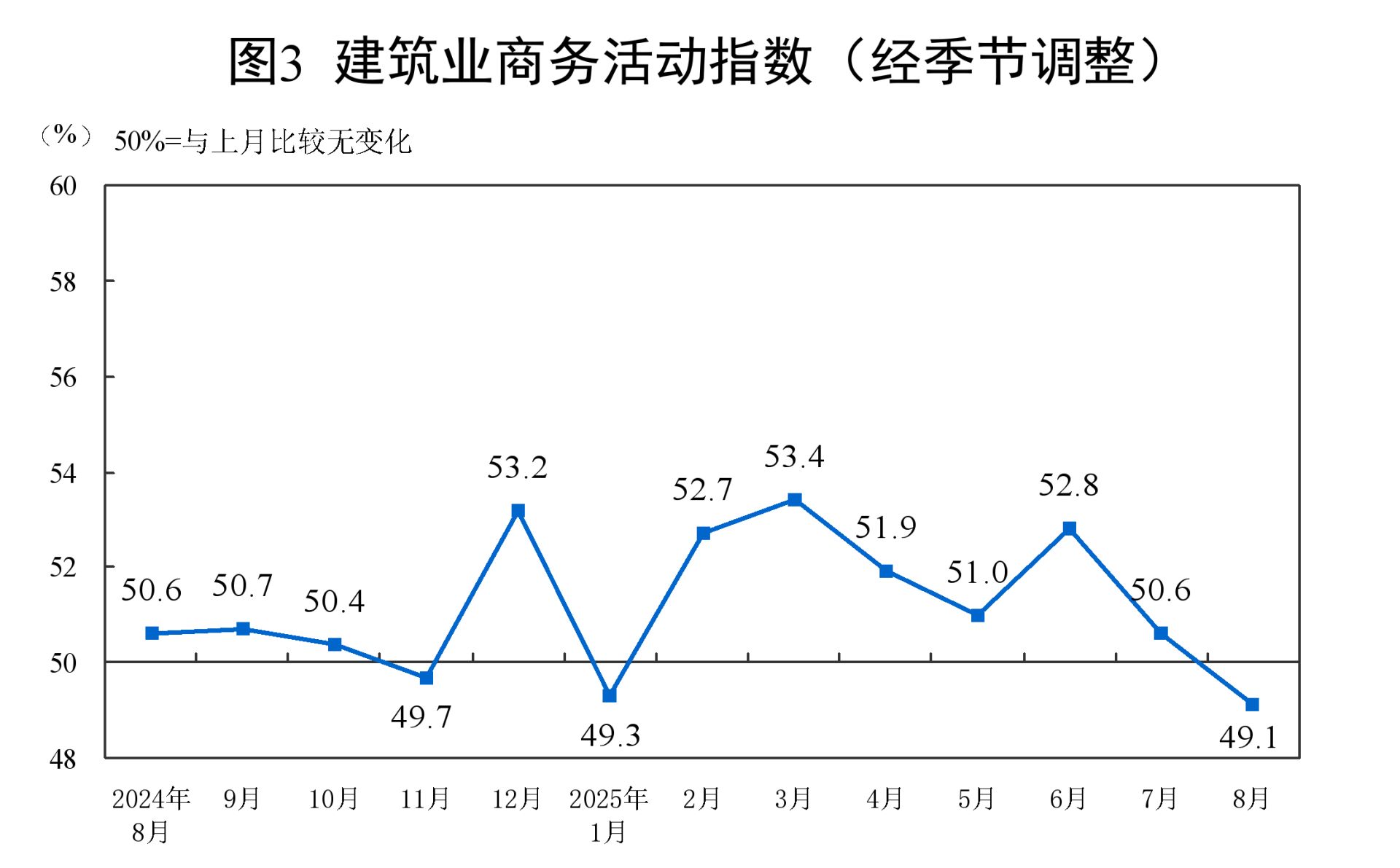 8月建筑业商务活动指数为49.1%,比上月下降1.5个百分点。