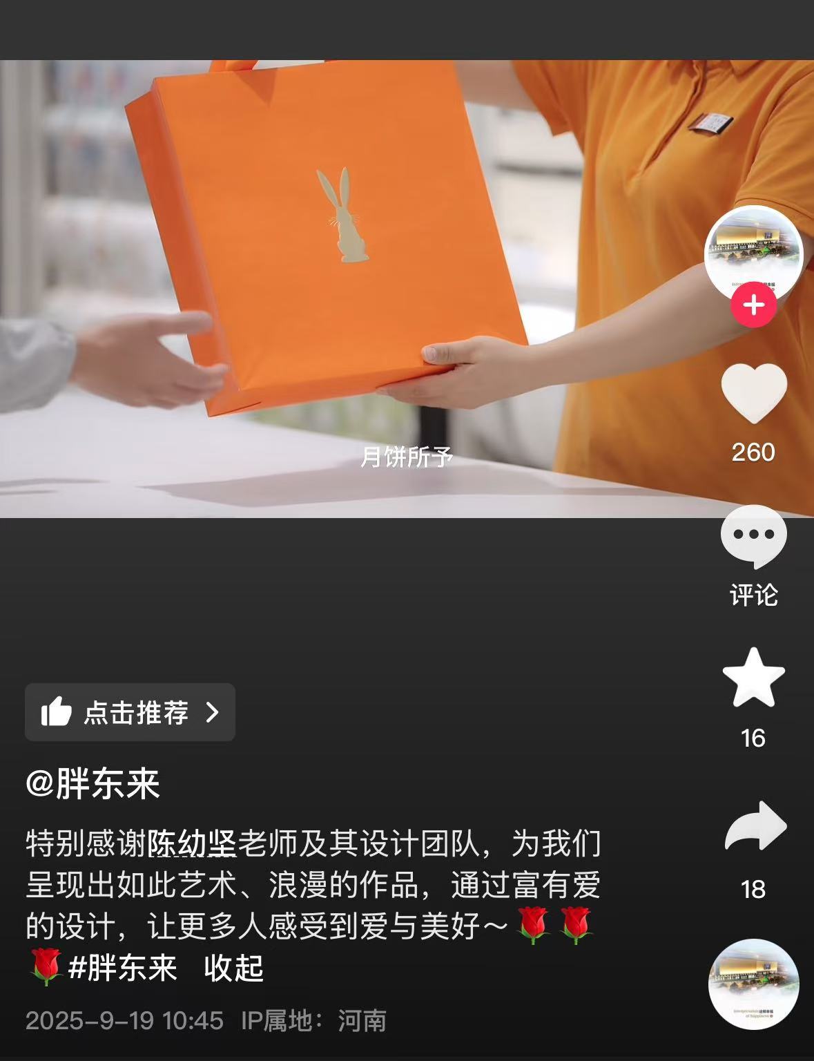 2025年1月,胖东来诚邀香港陈幼坚设计团队负责胖东来实业有限公司整体包装体系设计,设计内容包括:烘焙类视觉体系、熟食类视觉体系、月饼礼盒包装及散装月饼包装。其中2025年中秋月饼礼盒9款设计费用372万元,散饼包装21款设计费用42万元。胖东来方面表示,始终围绕着公司文化理念,严格执行健康、合理的价格标准,充分体现商品价值,避免过度包装带来的价格虚高,让商品回归至合理的状态。