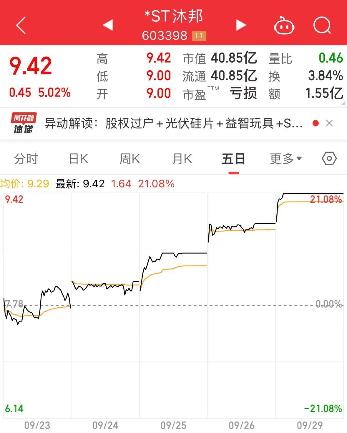 值得注意的是,*ST沐邦近期二级市场走势强劲,已经四连板,9月初至今累计涨幅达51.45%,最新收报9.42元,总市值41亿元。