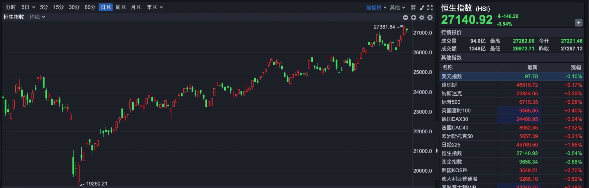 截至收盘,恒生指数报收于27140.92点,下跌146.20点,跌幅0.54%。