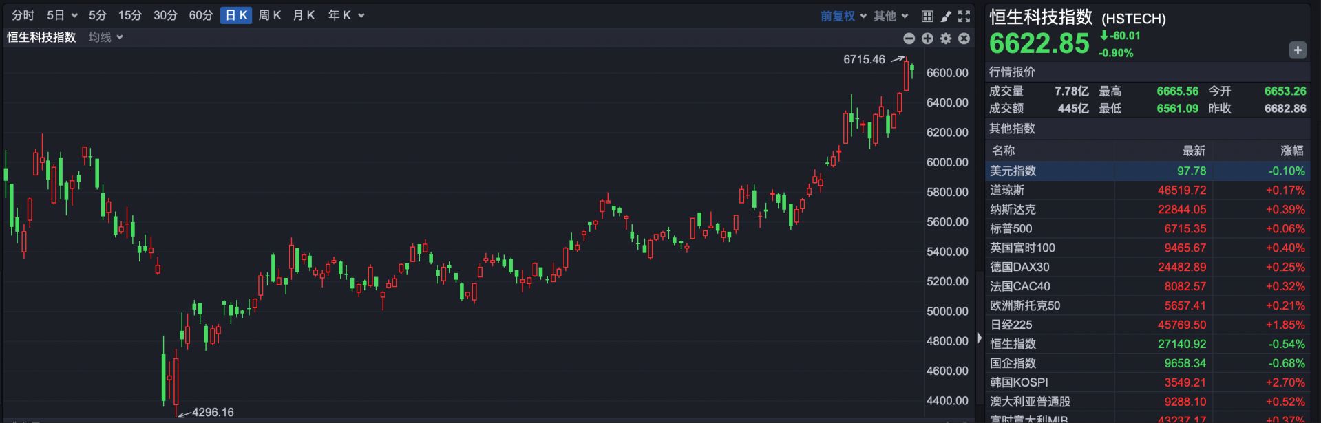 恒生科技指数报收于6622.85点,下跌60.01点,跌幅0.90%。
