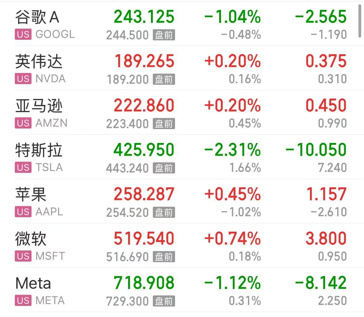 大型科技股涨跌不一,特斯拉跌超2%,谷歌、Meta、英伟达、亚马逊、苹果、微软上涨。