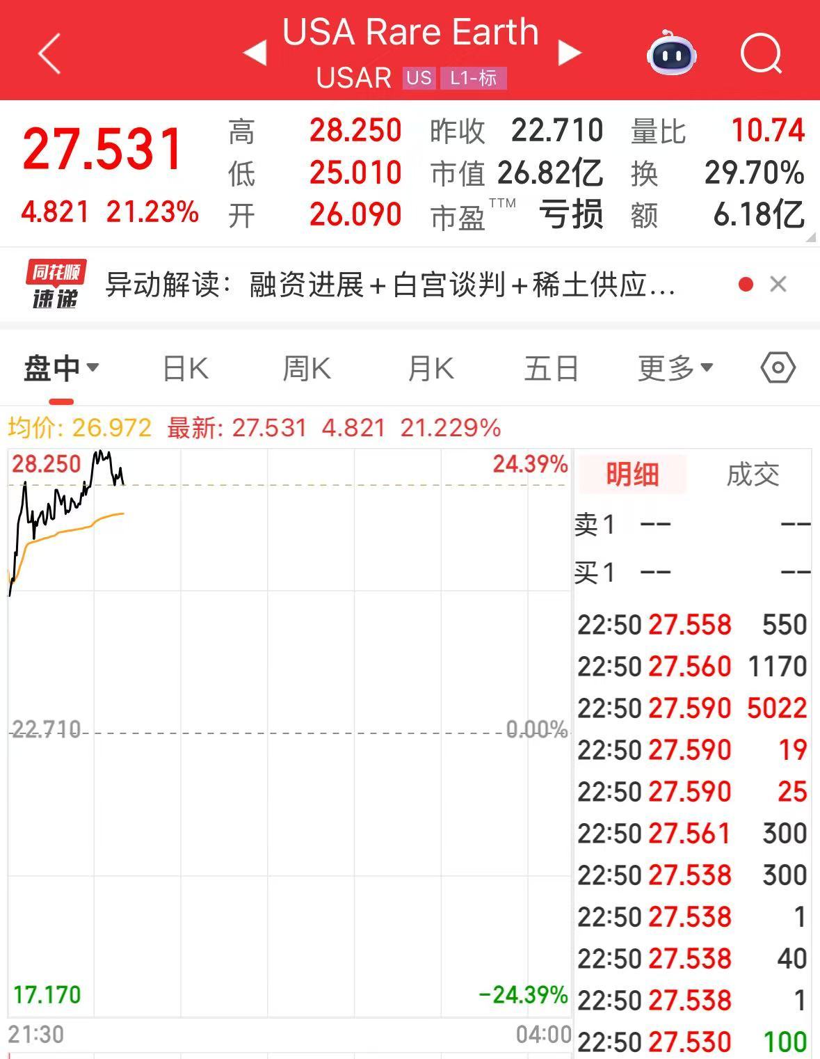 美股稀土概念股全线爆发,USA Rare Earth公司股价涨超21%。消息面上,该公司首席执行官Barbara Humpton确认公司正与美国白宫进行讨论。