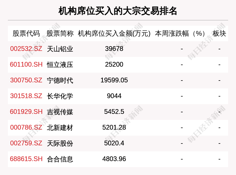 本周机构专用席位参与了90笔大宗交易,环比上周减少288笔。本周机构席位买入金额前3的公司为天山铝业、恒立液压、宁德时代,机构买入金额分别为3.97亿元、2.52亿元、1.96亿元。