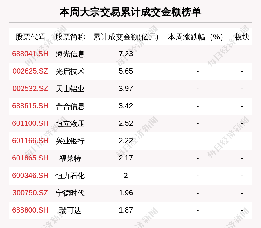 本周大宗交易累计成交金额前3的公司是海光信息、光启技术、天山铝业,累计成交金额分别为7.23亿元,5.65亿元,3.97亿元。