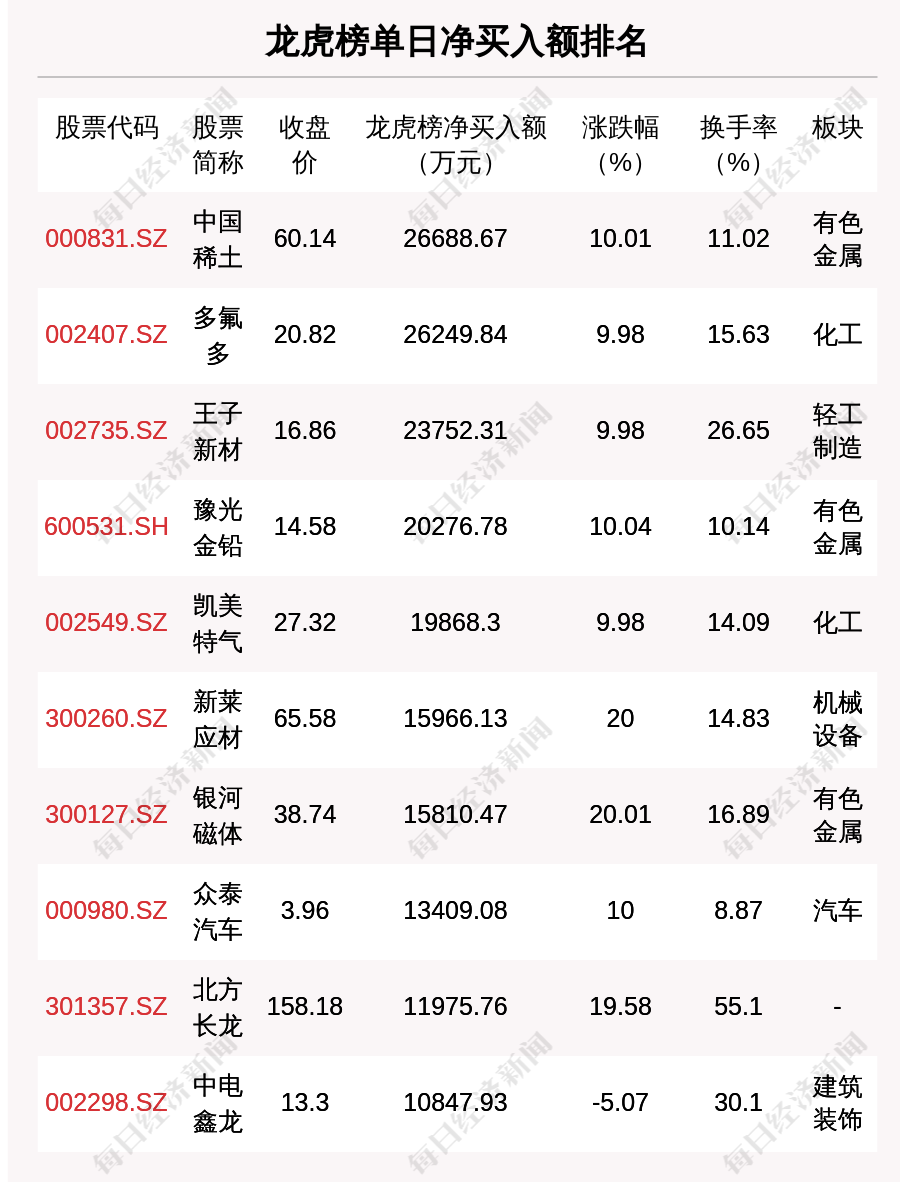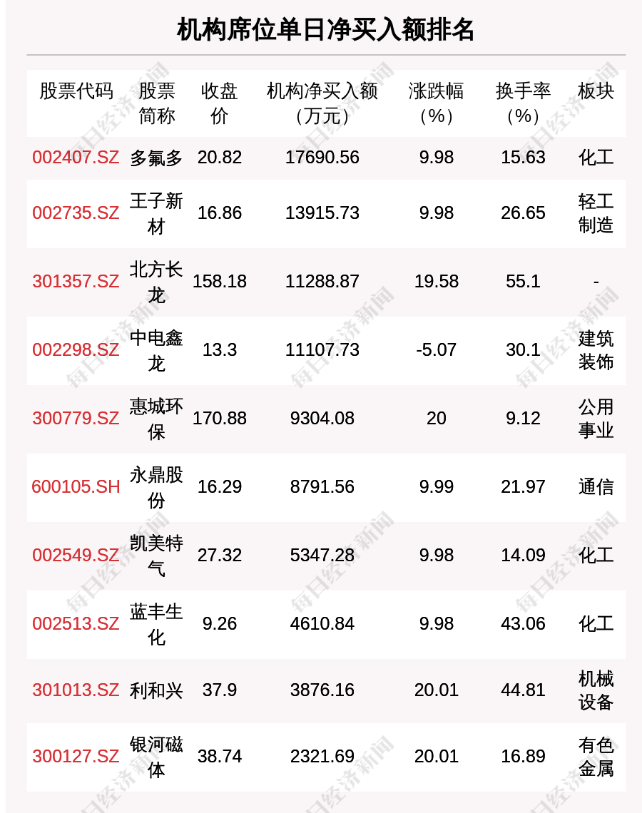 在龙虎榜中,涉及机构专用席位的个股有27只,净买入额前三的是多氟多、王子新材、北方长龙,分别为1.77亿元、1.39亿元、1.13亿元。