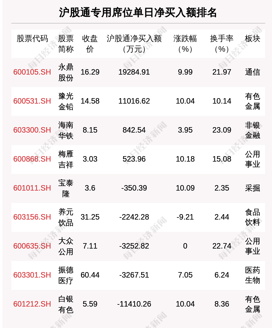 在龙虎榜中,涉及沪股通专用席位的个股有9只,永鼎股份的沪股通专用席位净买入额最大,净买入1.93亿元。