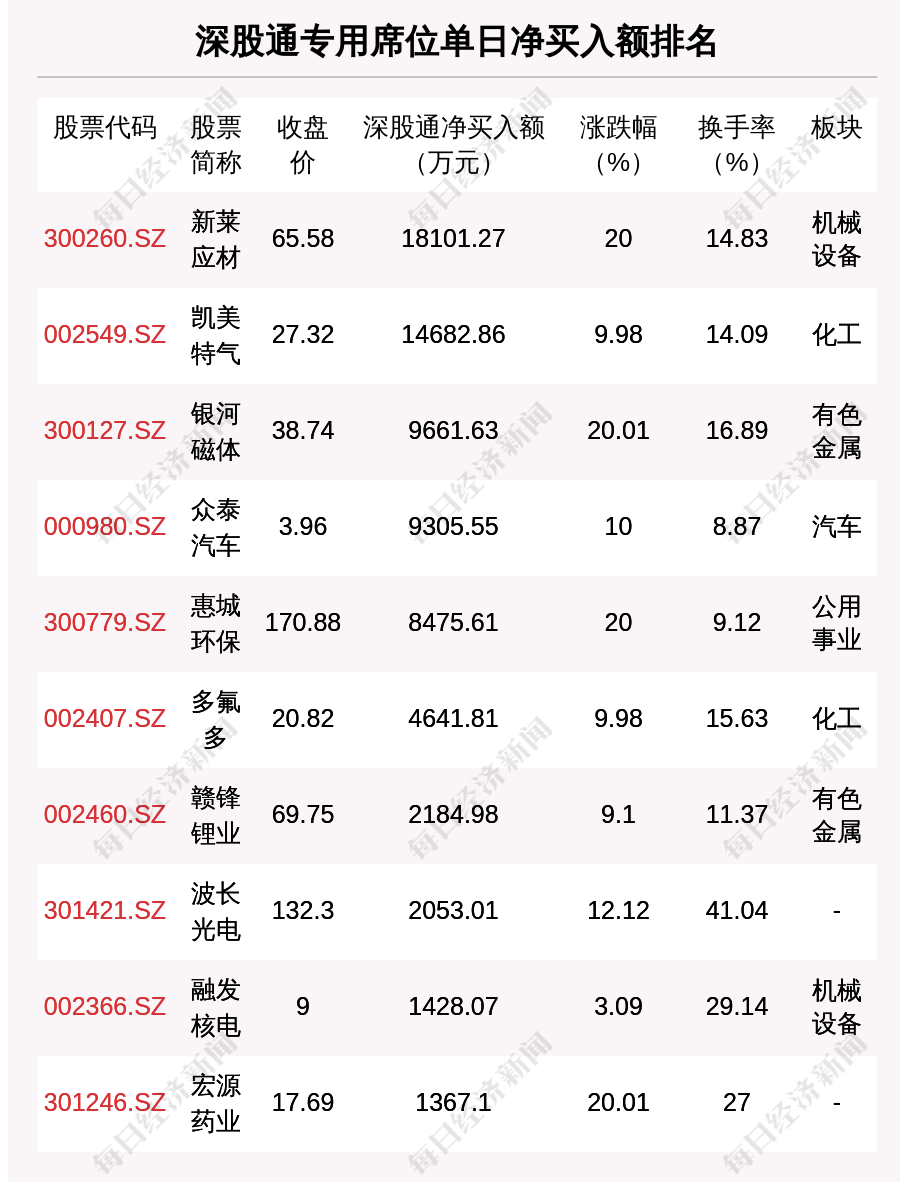 在龙虎榜中,涉及深股通专用席位的个股有13只,新莱应材的深股通专用席位净买入额最大,净买入1.81亿元。