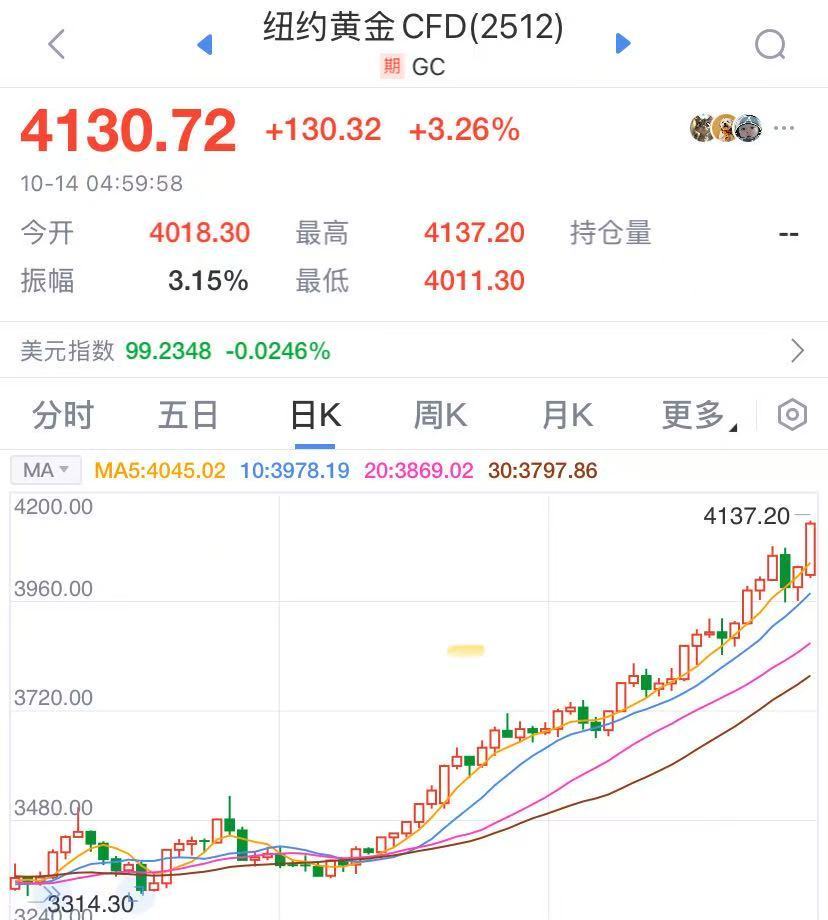 另一方面,现货黄金价格13日盘中突破每盎司4100美元关口,延续此前连续8周上涨的强势表现,再创历史新高。铂金与钯金价格亦大幅走高。