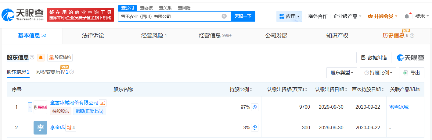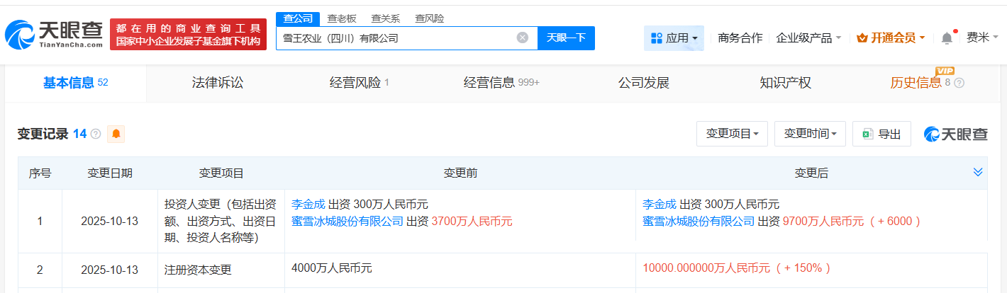 每经AI快讯,天眼查App显示,近日,雪王农业(四川)有限公司发生工商变更,注册资本由4000万元增至1亿元,增幅150%。该公司成立于2020年9月,法定代表人为杜瀟,经营范围包括初级农产品收购、水果种植、食用农产品批发等,由蜜雪冰城股份有限公司、李金成共同持股。