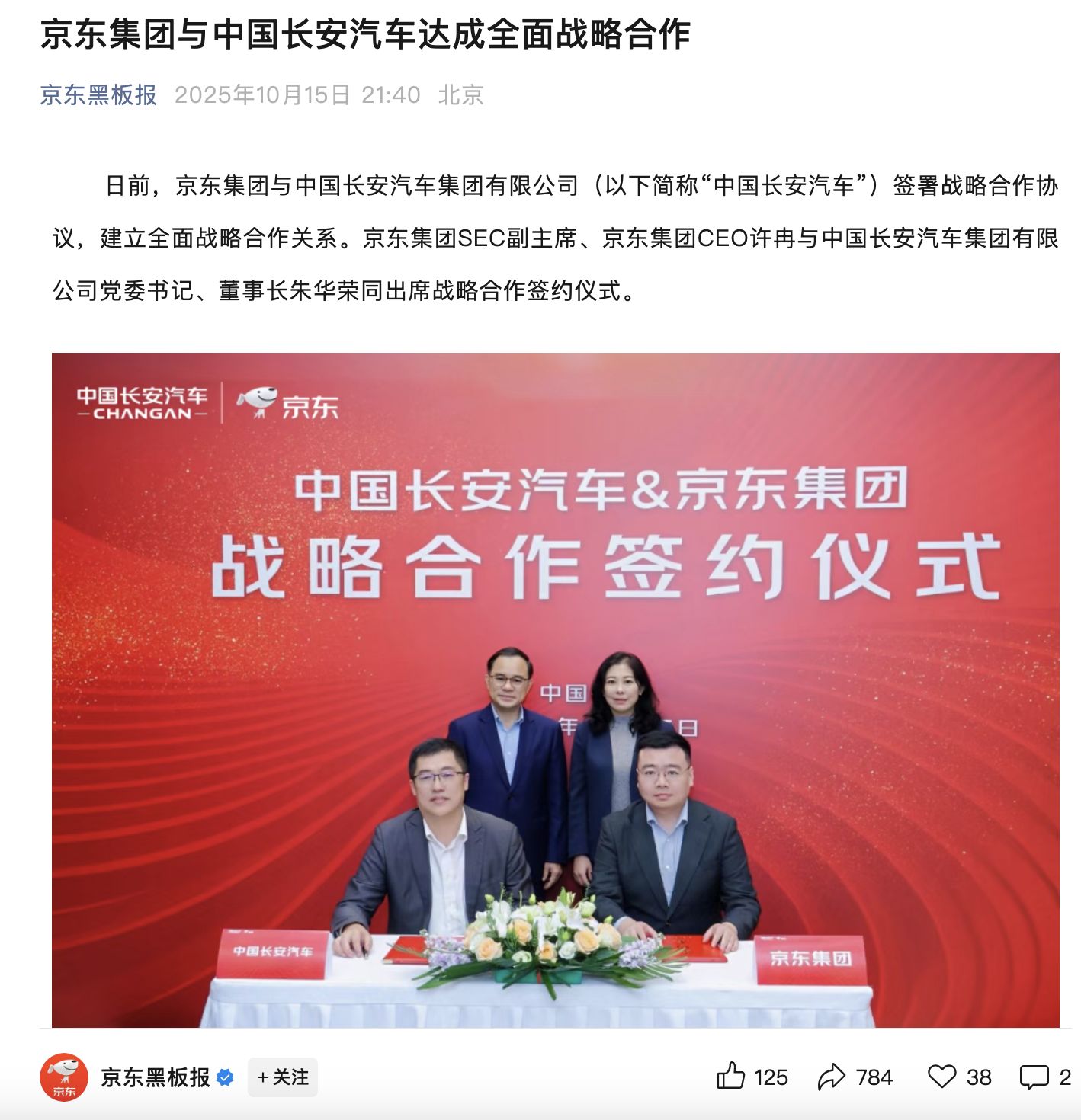 随后,今年新成立的汽车央企长安集团发文:长安万里,京彩纷呈!期待与未来出行新伙伴@京东 的惊喜合作!