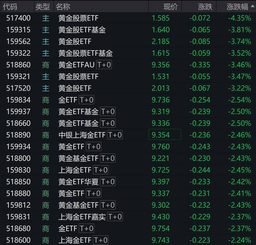 ETF方面,黄金股相关ETF跌超3%,商品黄金相关ETF跌超2%。