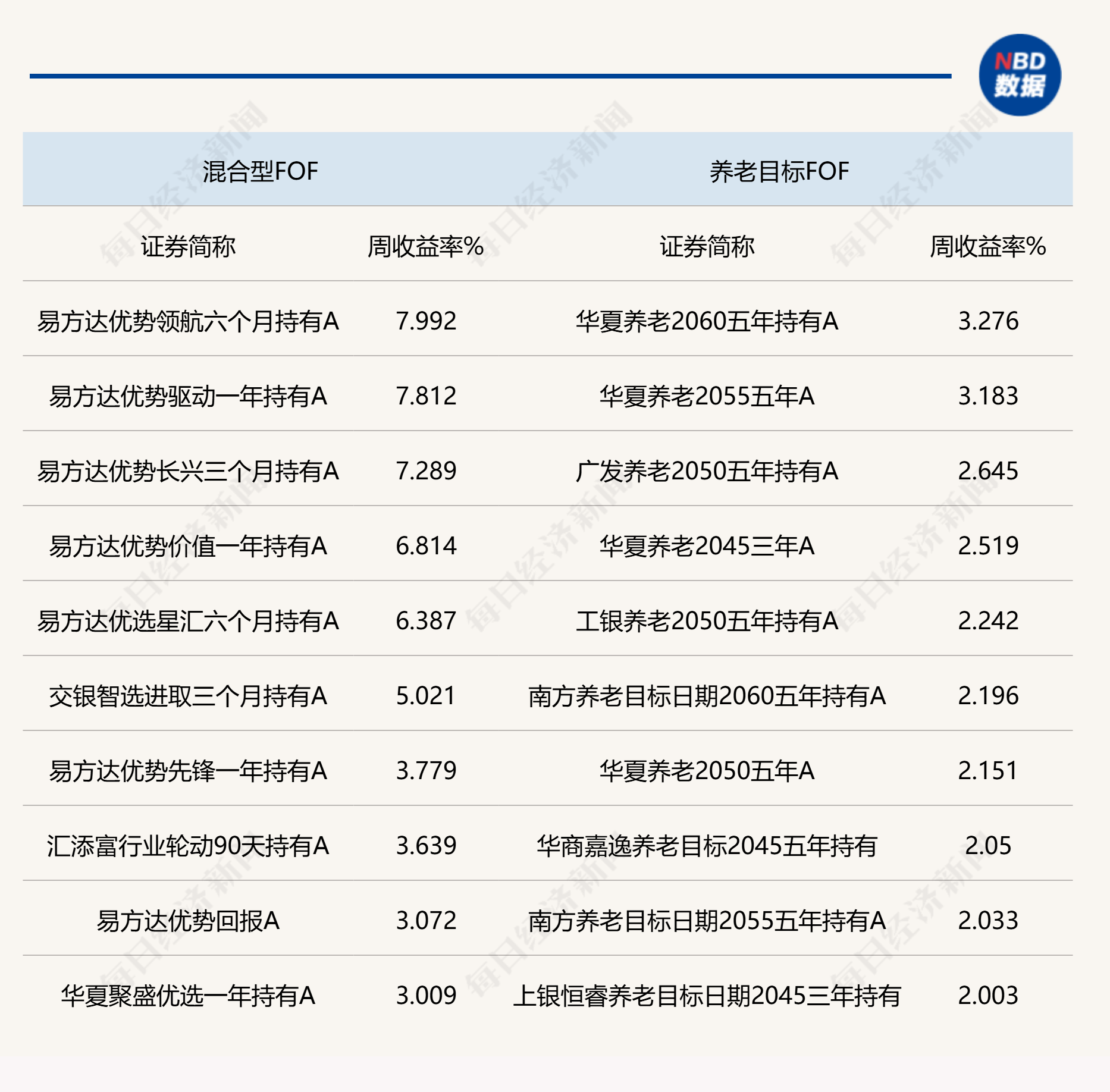 在此背景下,权益类FOF表现出色。Wind统计显示,全市场有6只FOF单周业绩收益率超过5%(统计初始基金),这在此前并不多见。不仅如此,有的绩优基金出自同一家基金公司,且单周业绩排名十分接近。