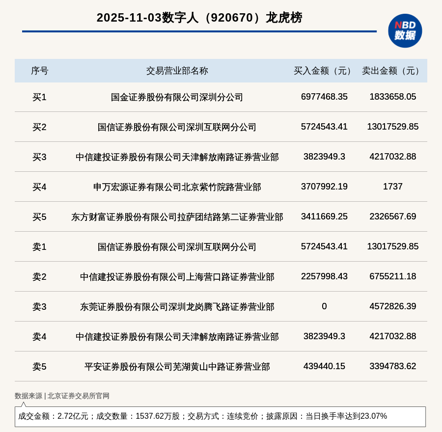 每经讯,2025年11月3日,北交所上市公司数字人(920670,收盘价:17.7元)登上龙虎榜,交易方式是连续竞价,披露原因是当日换手率达到23.07%,成交数量1537.62万股,成交金额2.72亿元。买一席位为国金证券股份有限公司深圳分公司,买入697.75万元;卖一席位为国信证券股份有限公司深圳互联网分公司,卖出1301.75万元。
