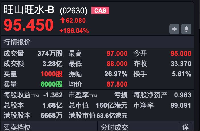 其中,旺山旺水-B(02630.HK)高开近185%。