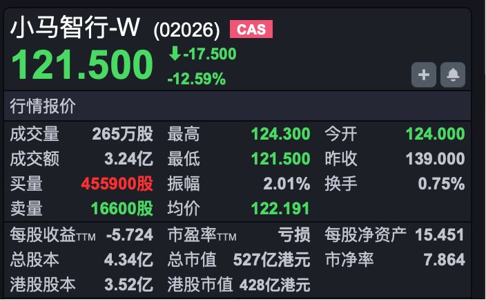 但另外三只新股早盘均告破发,其中小马智行-W(02026.HK)、文远知行-W(00800.HK)跌超12%,均胜电子(00699.HK)跌超4%。
