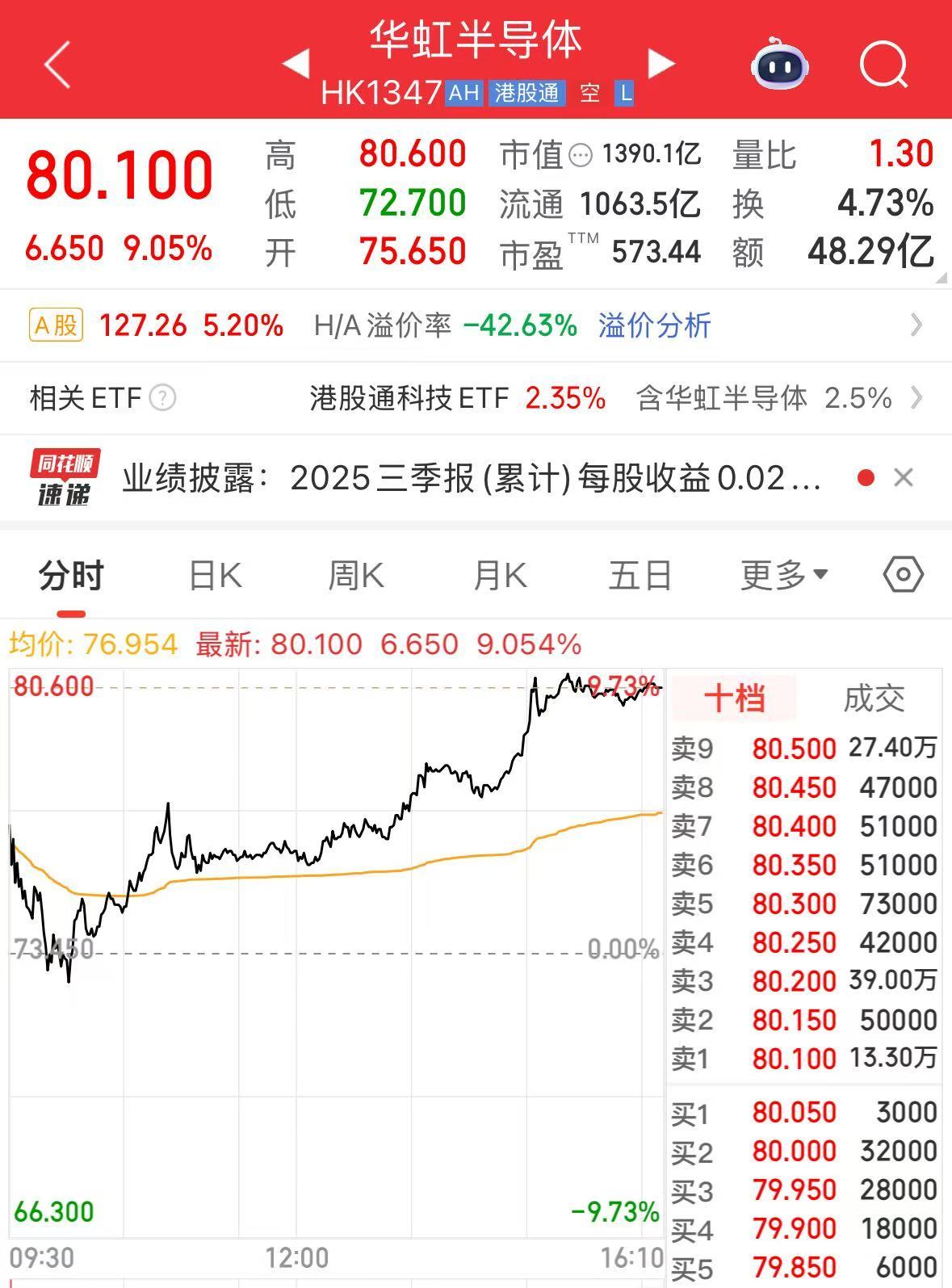市场方面,截至11月6日港股收盘,华虹半导体上涨9.05%,市值增长115.38亿港元(约合人民币105.69亿元)。
