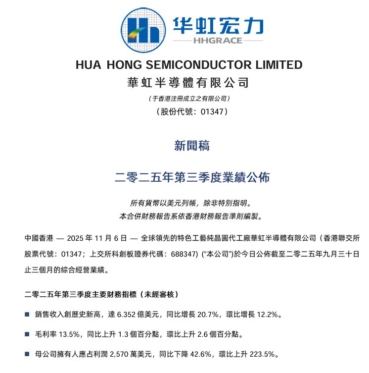 11月6日,华虹半导体(HK01347,股价80.1港元,市值1390.1亿港元)港股公告,第三季度销售收入创历史新高,达6.352亿美元,同比增长20.7%,环比增长12.2%;母公司拥有人应占利润2570万美元,同比下降42.6%,环比上升223.5%。
