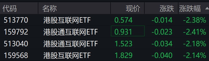 受重仓股调整影响,港股互联网相关ETF集体跌超2%。