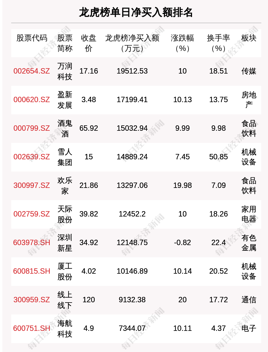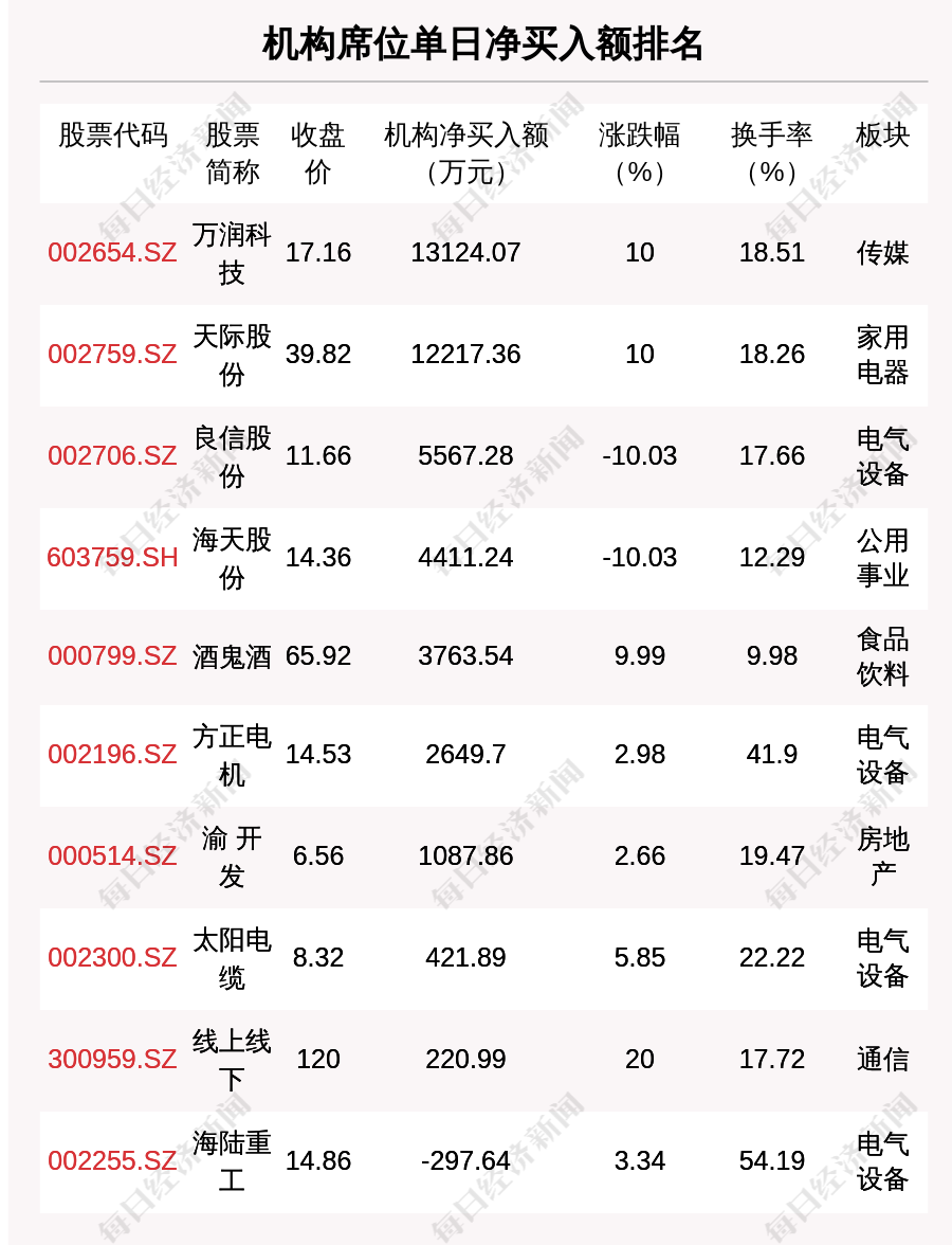 在龙虎榜中,涉及机构专用席位的个股有25只,净买入额前三的是万润科技、天际股份、良信股份,分别为1.31亿元、1.22亿元、5567.28万元。