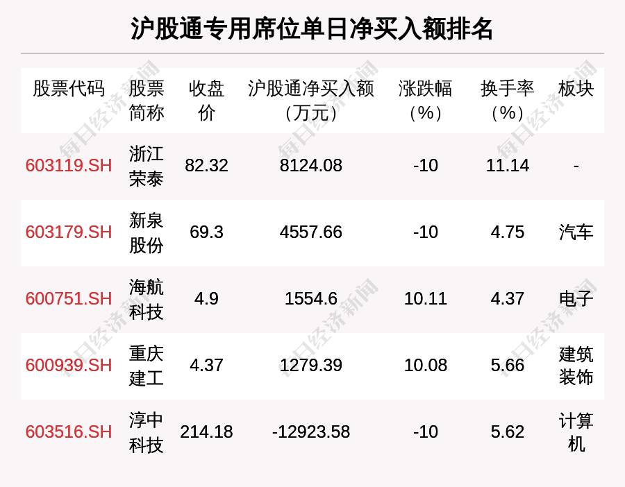 在龙虎榜中,涉及沪股通专用席位的个股有5只,浙江荣泰的沪股通专用席位净买入额最大,净买入8124.08万元。