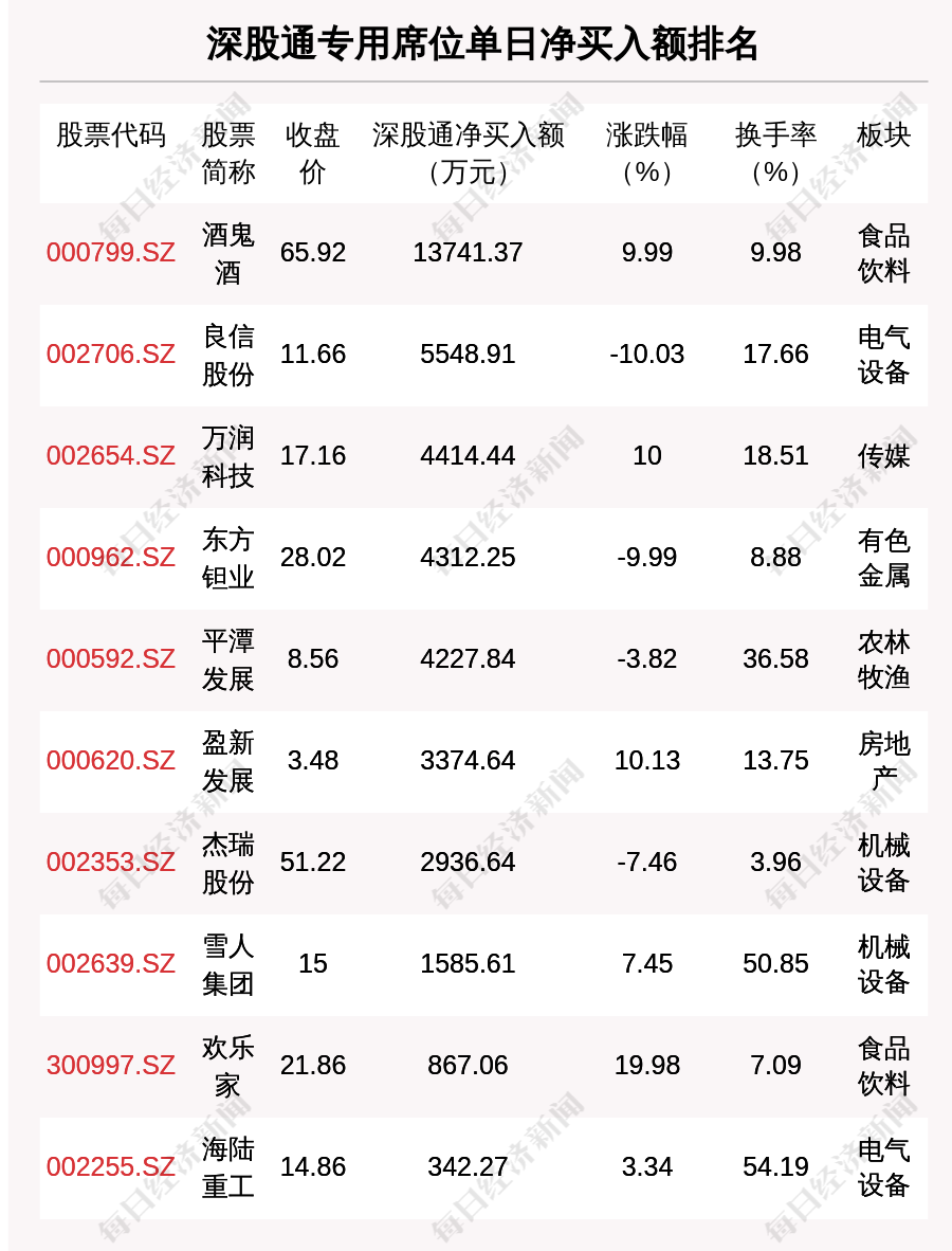 在龙虎榜中,涉及深股通专用席位的个股有14只,酒鬼酒的深股通专用席位净买入额最大,净买入1.37亿元。