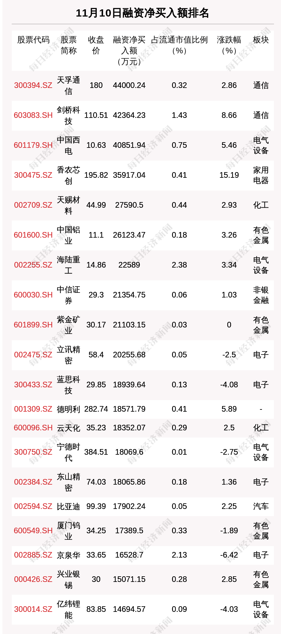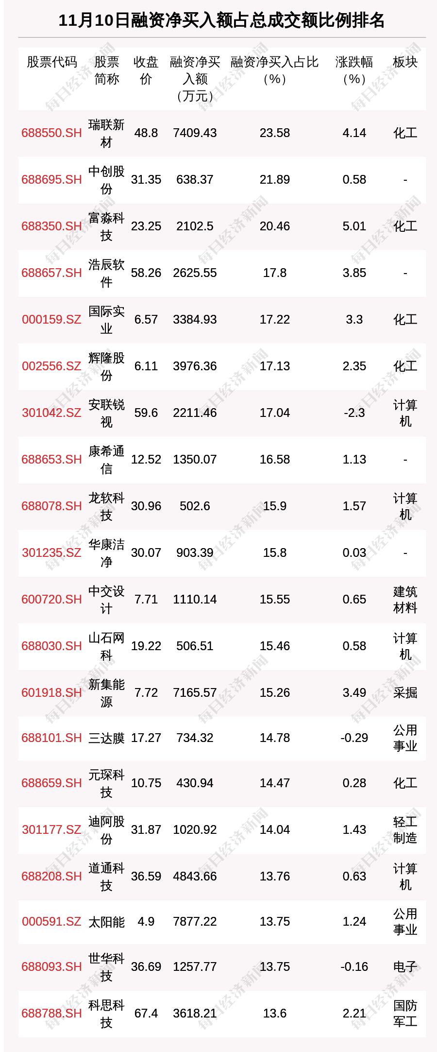 11月10日两市共有1804只个股有融资资金净买入。共有66只股票融资净买入额占总成交金额比例超10%,其中瑞联新材、中创股份、富淼科技排名前三,占比分别为23.58%、21.89%、20.46%。