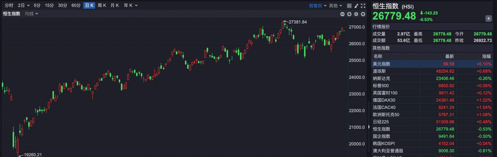 截至发稿,恒生指数报26779.48点,下跌143.25点,跌幅0.53%。