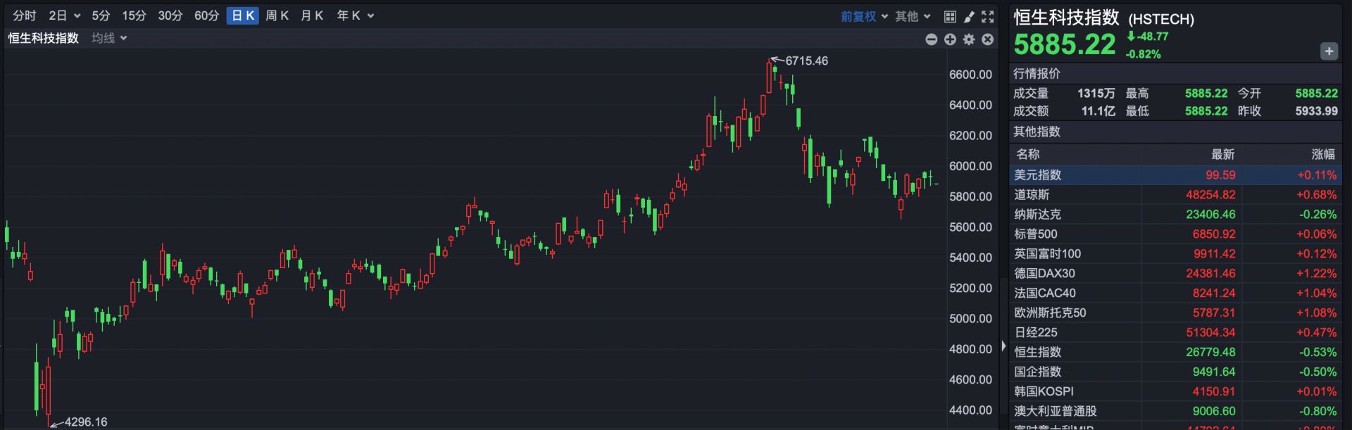 恒生科技指数报5885.22点,下跌48.77点,跌幅0.82%。
