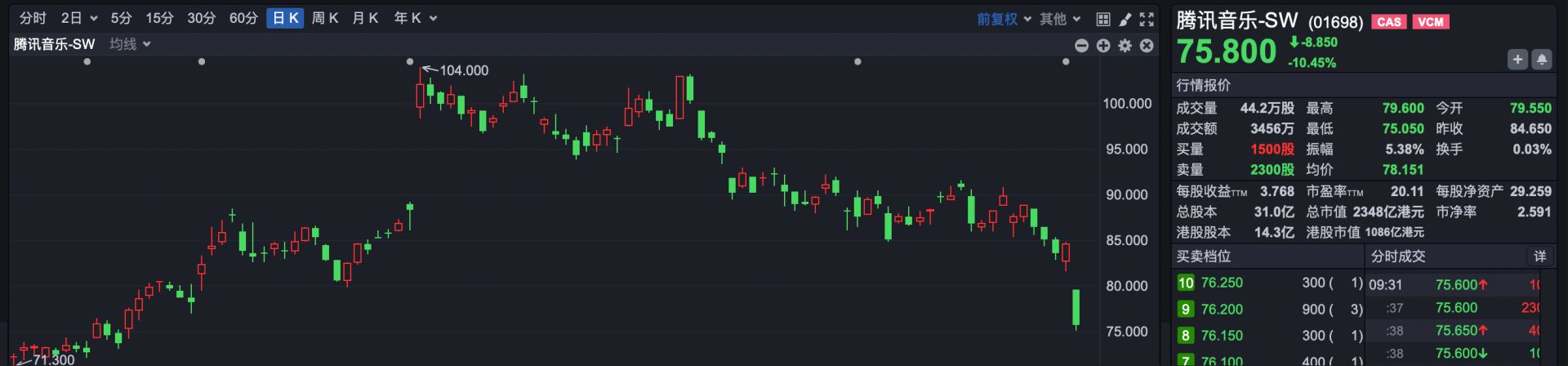 此外,腾讯音乐-SW(01698.HK)公布三季报,第三季度公司总收入为人民币84.6亿元,同比增长20.6%;净利润21.5亿元,同比增长36.0%。值得注意的是,从用户表现来看,本季度内,腾讯音乐在线音乐服务月活用户数仍同比下滑,为5.51亿。尽管业绩维持增长,但腾讯音乐早间股价大幅回落,截至发稿前跌幅超过10%。