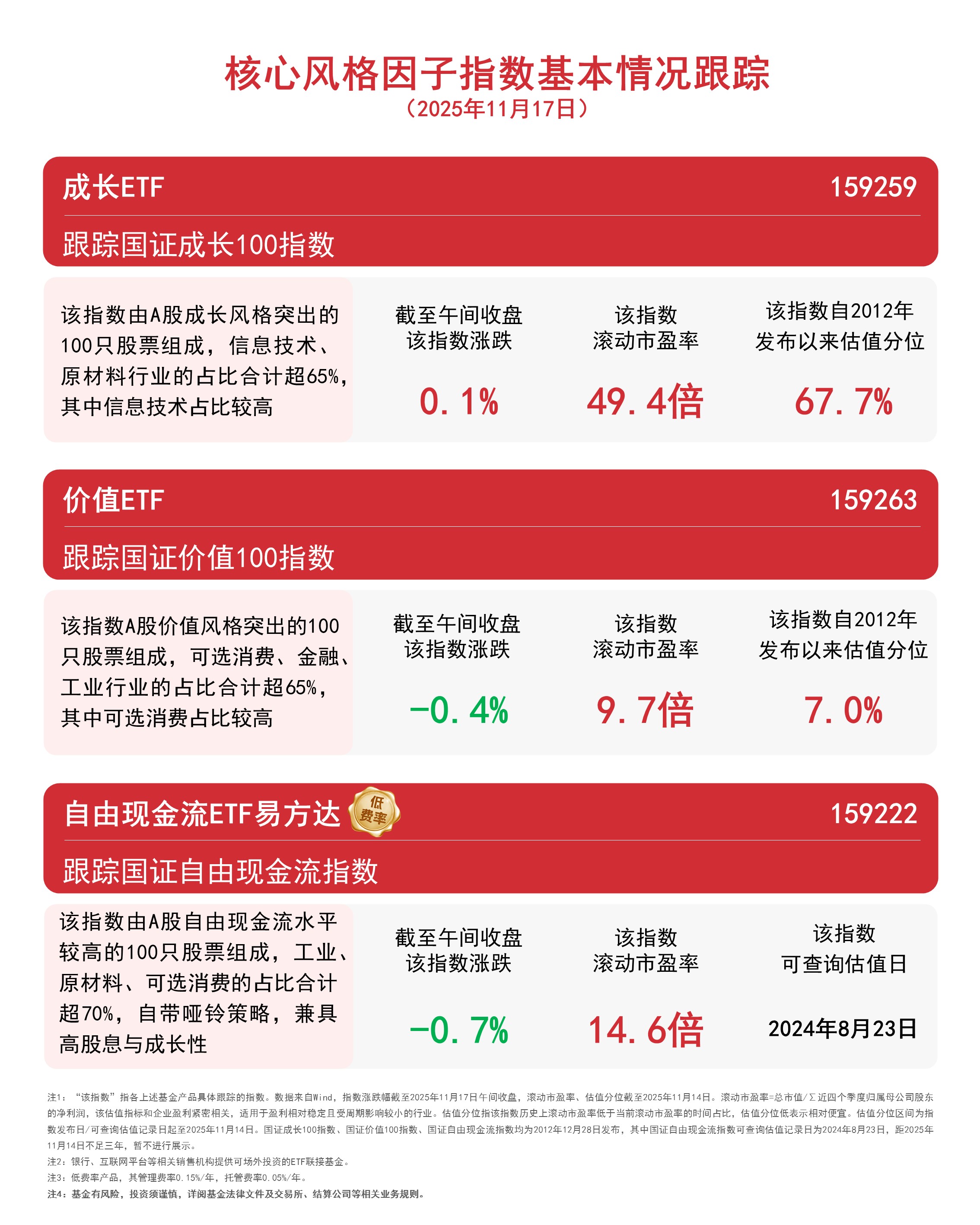 国证价值100指数采用“高分红+高自由现金流+低市盈率”三维筛选体系,优选价值标的,历史表现稳健;国证自由现金流指数则采用自由现金流率进行选样,兼具高股息与成长性。价值ETF(159263)和自由现金流ETF易方达(159222)分别跟踪以上指数,可助力投资者把握相关风格投资机遇。