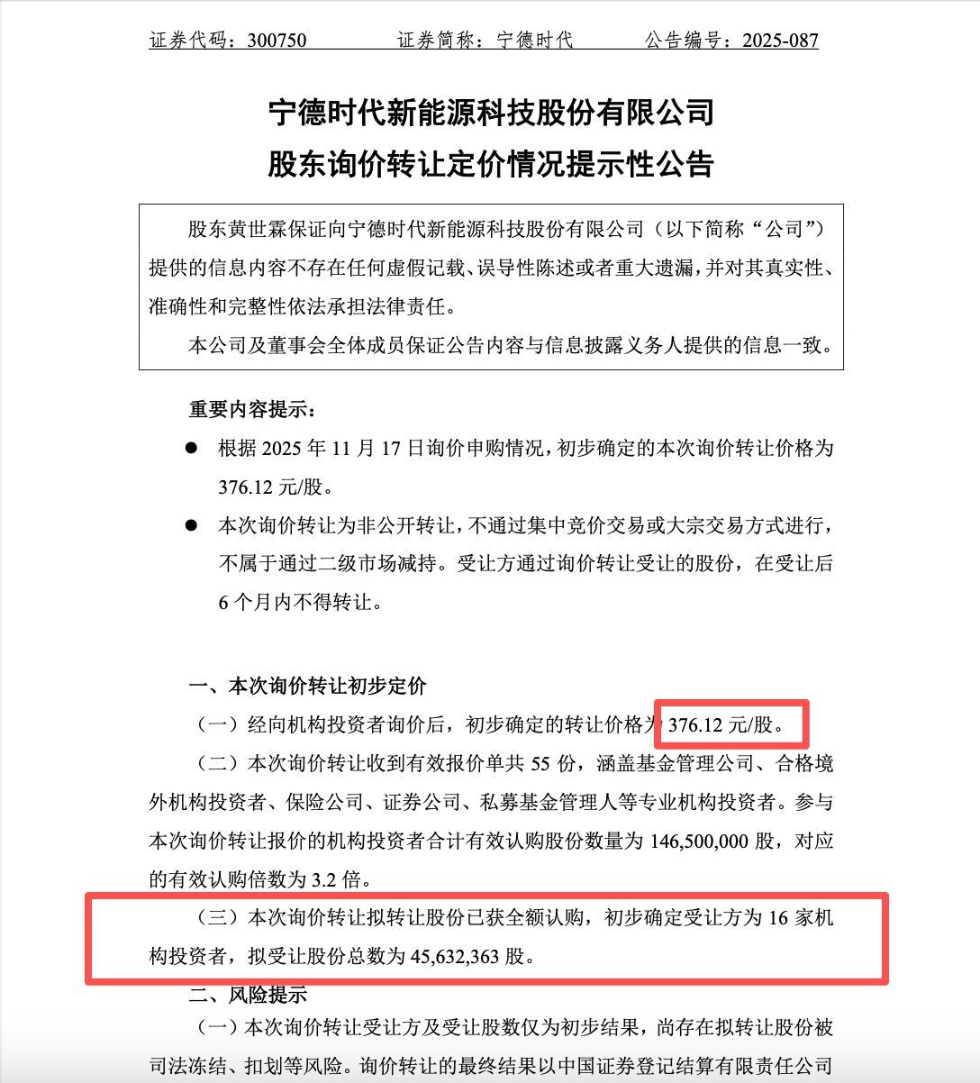 11月17日晚,宁德时代披露公告,根据当天询价申购情况,初步确定的本次询价转让价格为376.12元/股,较前收盘价折价约6.9%,宁德时代方面称这是有史以来成交折扣最窄的具规模询价转让项目。