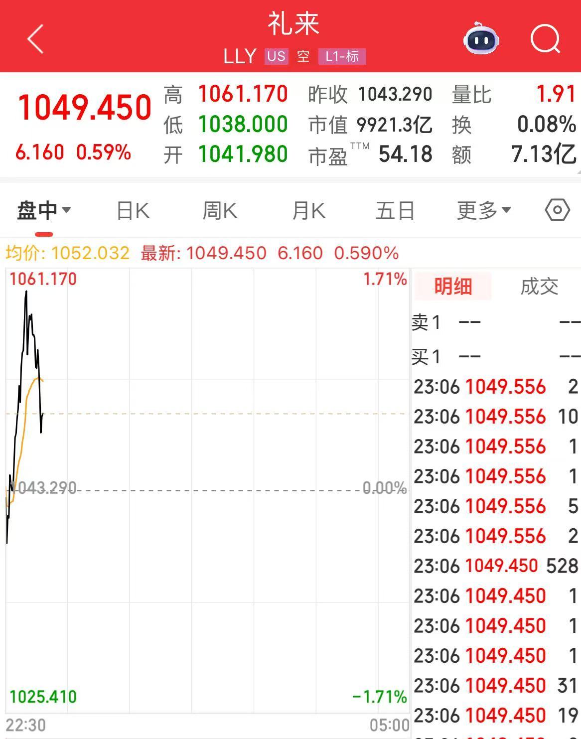 礼来公司一度成为世界上第一家市值达到1万亿美元医疗保健公司,日内一度上涨超1.7%,现涨0.59%。今年以来,礼来股价累计上涨38%。