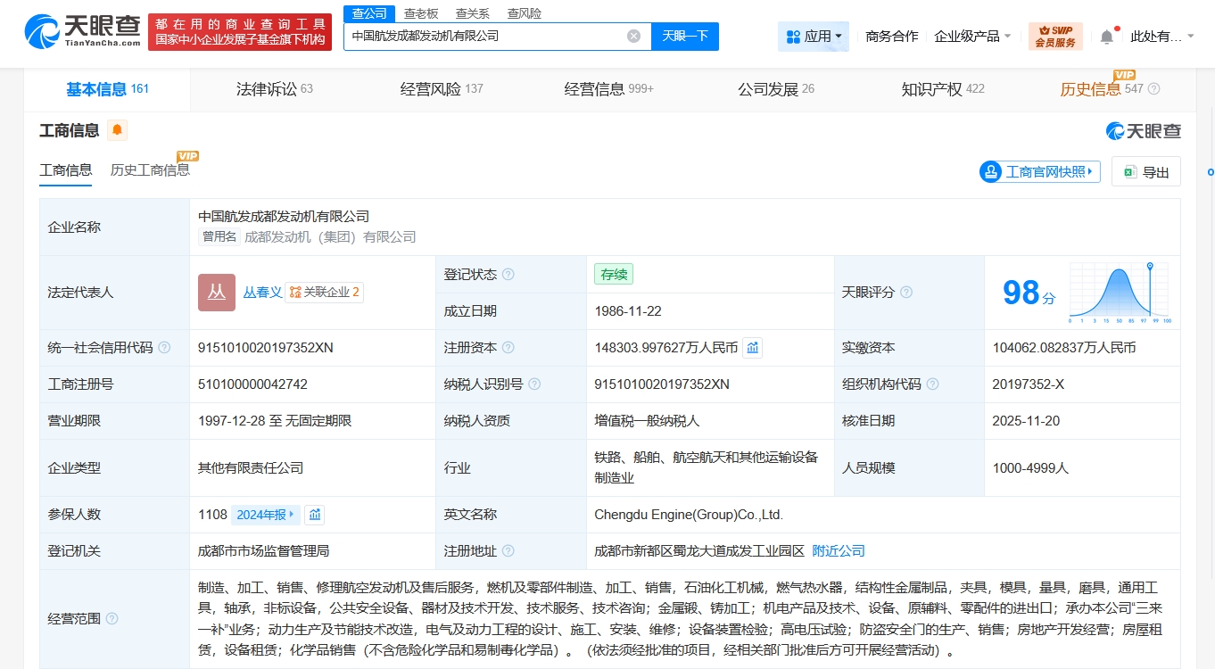 每经AI快讯,天眼查工商信息显示,近日,中国航发成都发动机有限公司发生工商变更,四川省投资集团有限责任公司退出股东行列,新增成都重产空天动力科技有限公司、四川能源发展集团有限责任公司、国家军民融合产业投资基金二期有限责任公司为股东,注册资本由约10.4亿元人民币增至约14.8亿元人民币,增幅约42.5%。同时,多位高管发生变更。中国航发成都发动机有限公司成立于1986年11月,法定代表人为丛春义,经营范围包括制造、加工、销售、修理航空发动机及售后服务,公共安全设备、器材及技术开发、技术服务、技术咨询等。股东信息显示,该公司由中国航空发动机集团有限公司、成都先进制造产业投资有限公司及上述新增股东等共同持股。