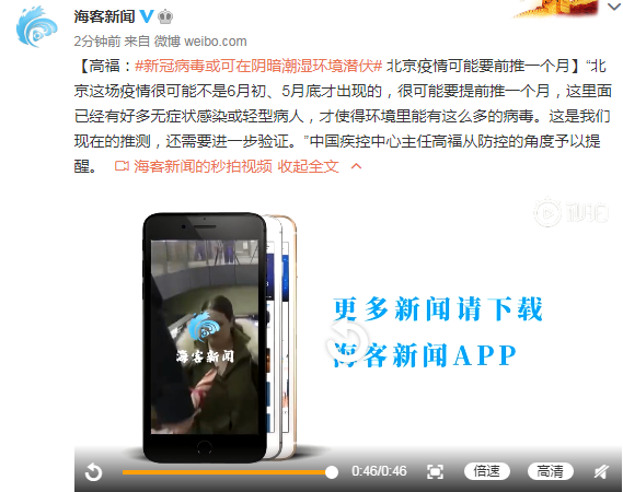 据海外网“海客新闻”,中国疾控中心主任高福从防控的角度予以提醒,“北京这场疫情很可能不是6月初、5月底才出现的,很可能要提前推一个月,这里面已经有好多无症状感染或轻型病人,才使得环境里能有这么多的病毒。这是我们现在的推测,还需要进一步验证。”