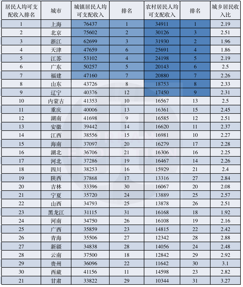 从全国所有省(市、自治区)居民人均可支配收入排名看——
