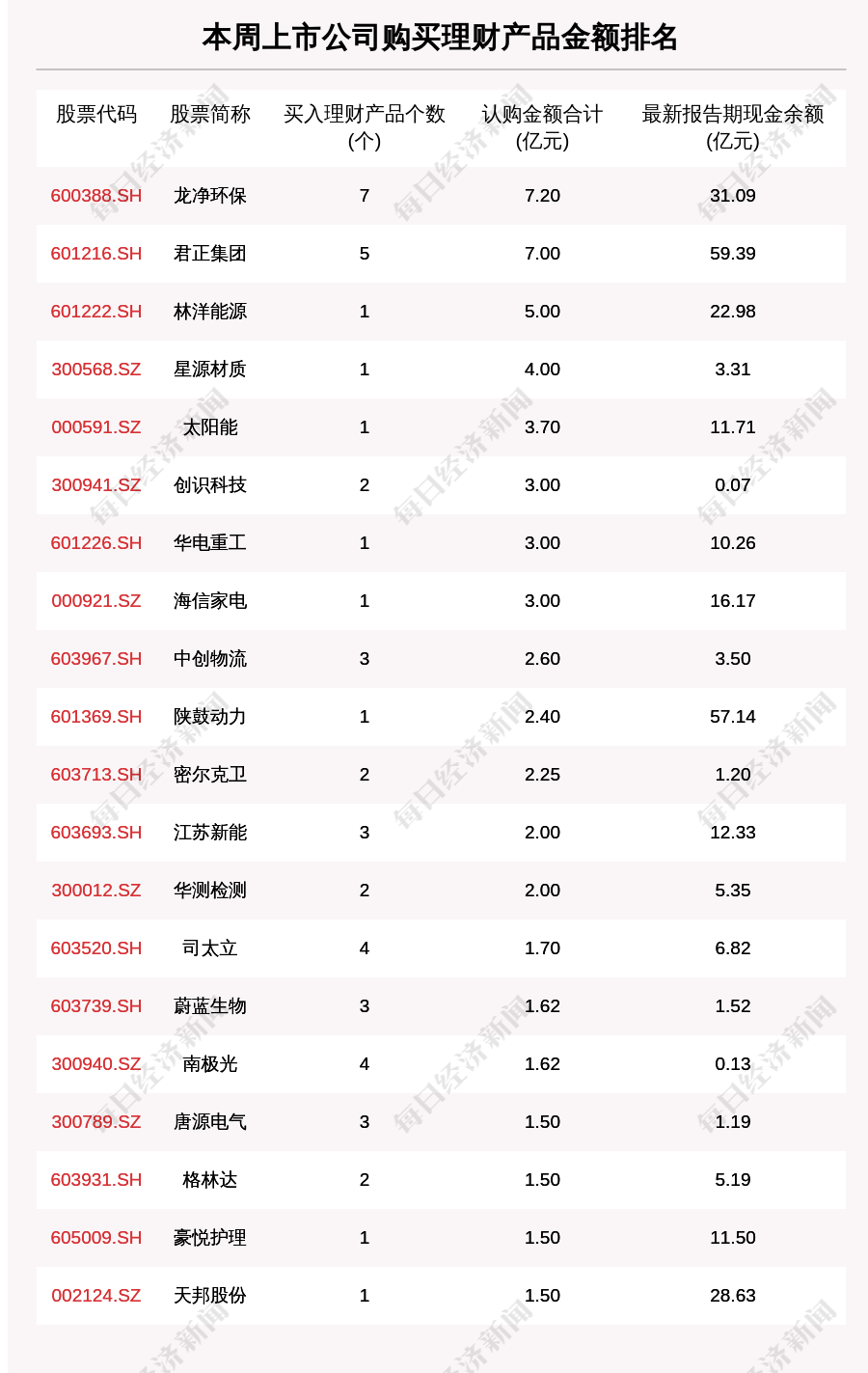 从买入金额上来看,购买理财产品金额排名前三的公司是龙净环保(600388.SH)、君正集团(601216.SH)、林洋能源(601222.SH),买入金额分别为7.20亿元、7.00亿元、5.00亿元。