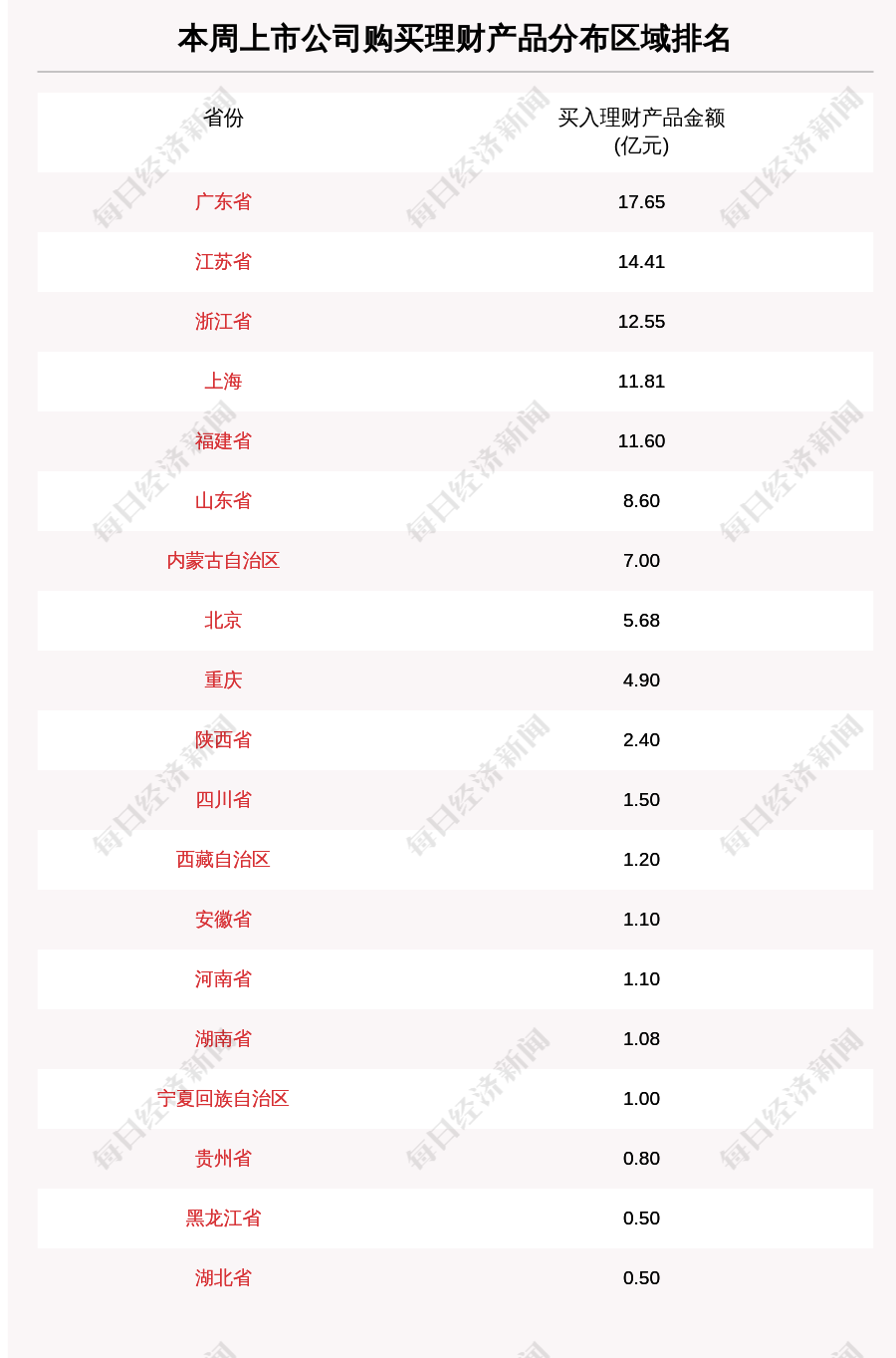 从上市公司所属地区上来看,本周买入理财产品金额排名前三的地区分别是广东省、江苏省、浙江省。